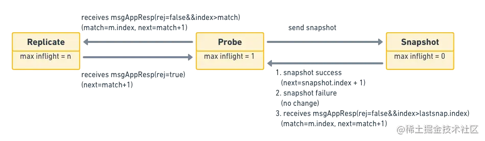 node.Advance()告诉raft,这批状态更新处理完了,状态已经演进了,可以给我下一批Ready让我处理。