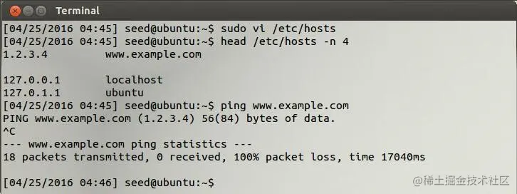 如图,成功ping www.example.com得到自己设置的1.2.3.4的DNS解析ip地址