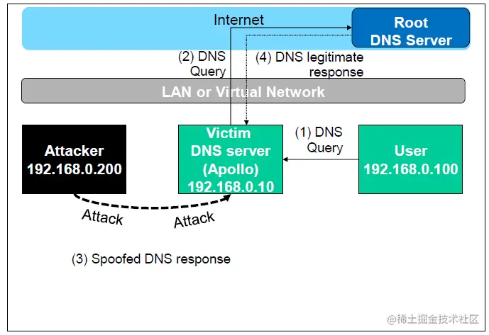 当User向DNS Server发送DNS查询的时候,Attacker监听了这个DNS查询请求,然后在DNS Server回复正确的DNS Response之前,先回复一个伪造欺骗的DNS Response给User,从而达到了DNS欺骗的效果。
