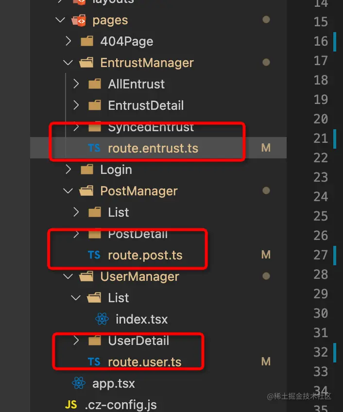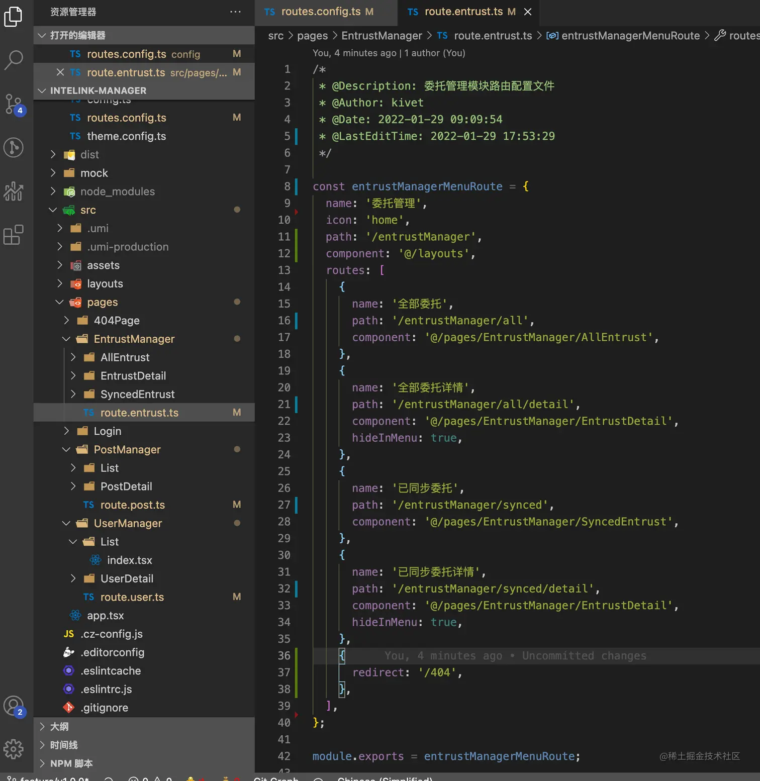 将各模块的路由配置在各自的页面模块下,如上面的的用户管理的路由就配置在 src/pages/UserManager 目录下。