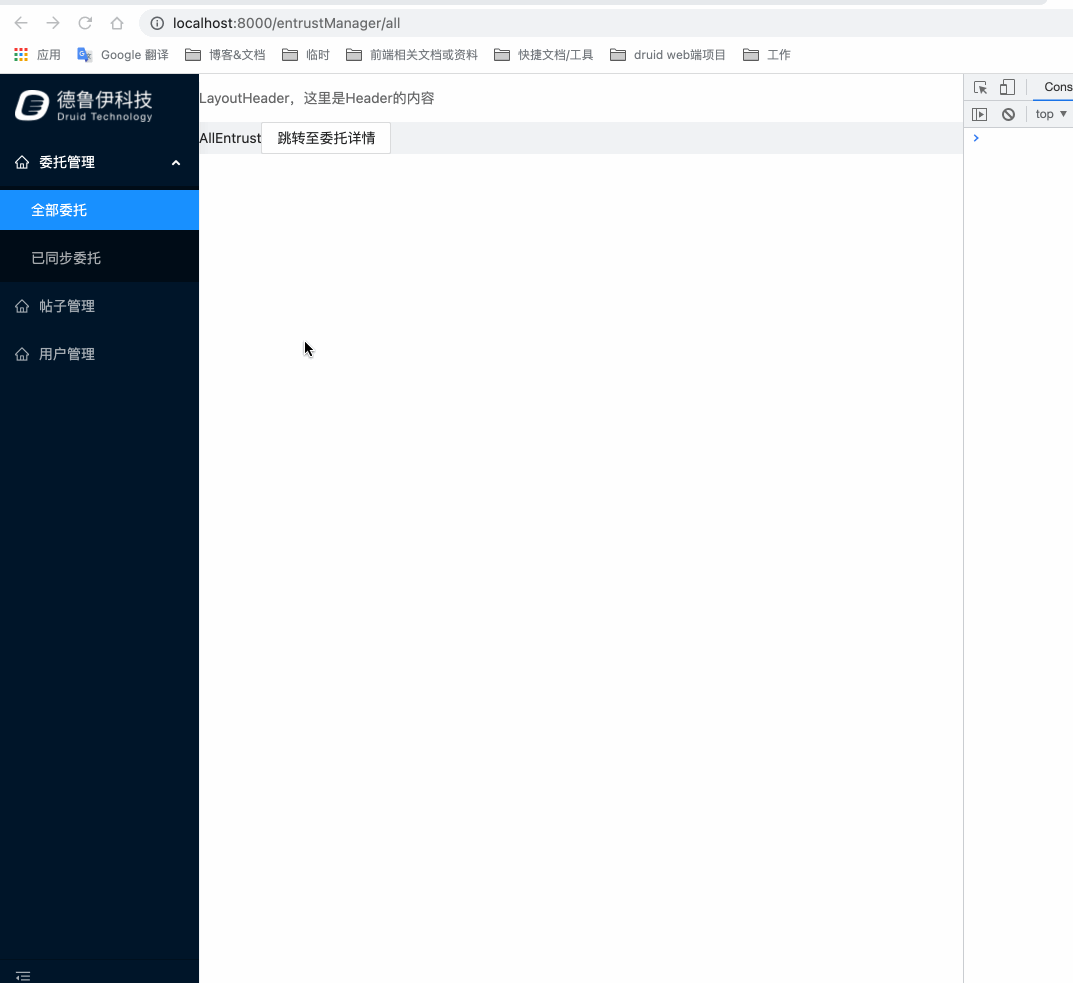 hideInMenu: true进行隐藏。如上面的那些委托详情。 - 不需要展示到菜单栏的路由,如登录页,使用