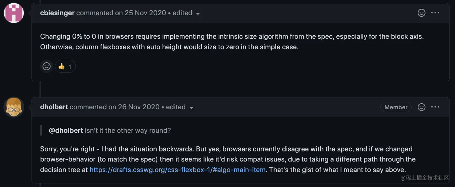 于是我开始借助搜索引擎。在stackoverflow上翻阅片刻后看到了这个问答:CSS flex-basis: 0% has different behaviour to flex-basis: 0px。问题中贴出的代码示例和自己遇到的情况极其相似。哈?flex-basis 值为 0% 和值为 0px 结果会有差?