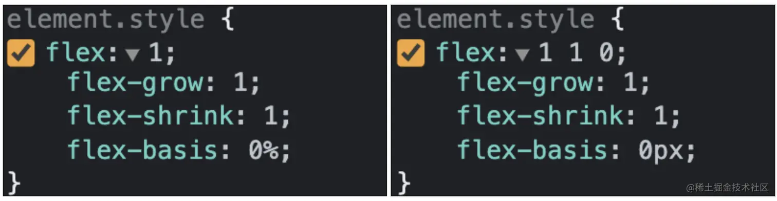 浏览器把 flex: 1 中的 flex-basis 解析为了 0%,与W3C文档描述的 flex: 1 1 0; 并不一致。