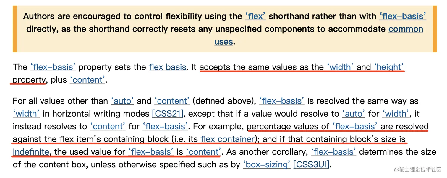 但是读到第二句红色下划线处,它描述了这样一种特殊情况:如果 flex-basis 的值为百分数,且它flex容器的尺寸没有被显式设置,此时 flex-basis 的值会被解析为 content。