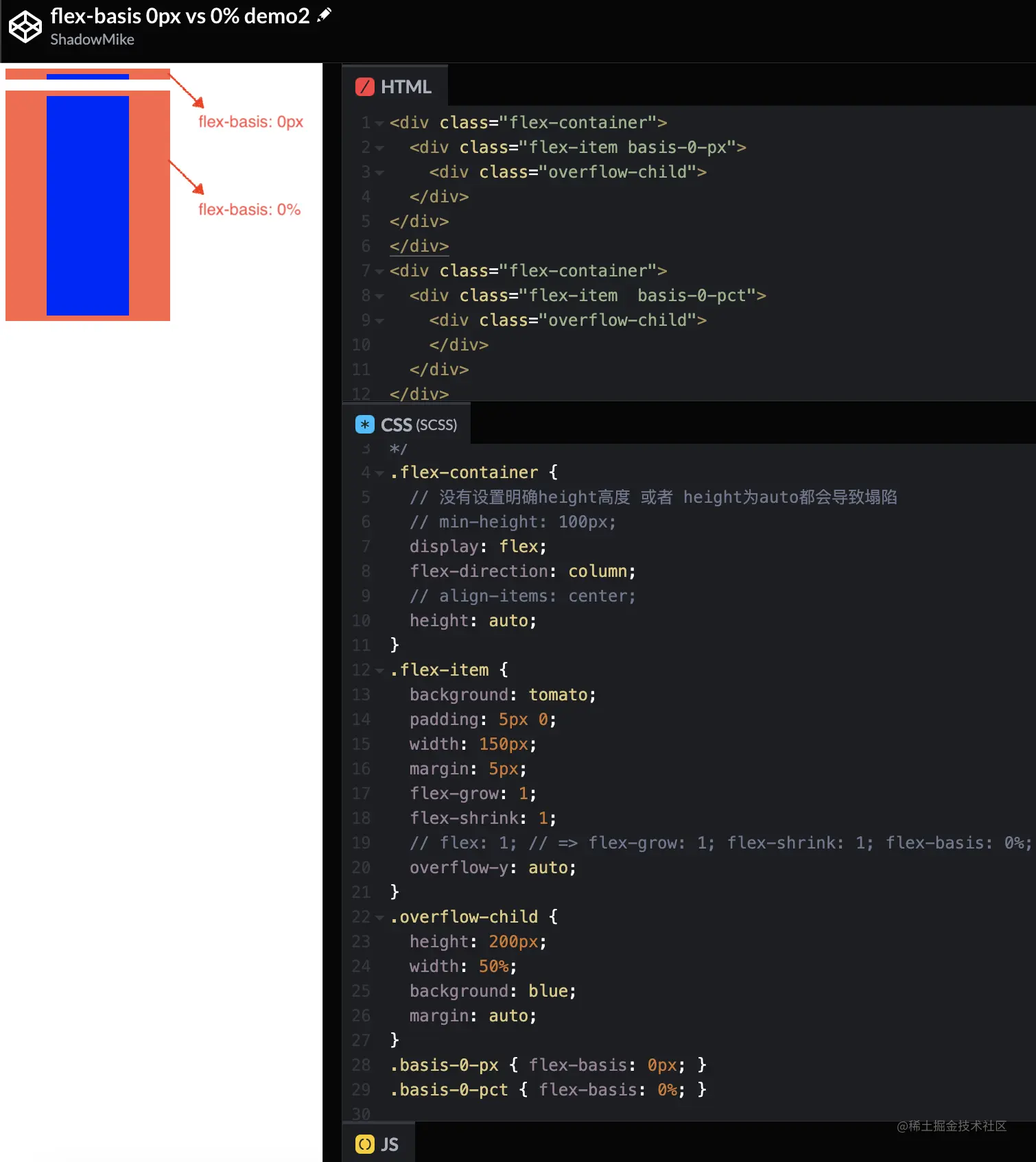 我又写了一个demo,大家能更直观的看到 flex-basis: 0px、flex-basis: 0% 的差异: