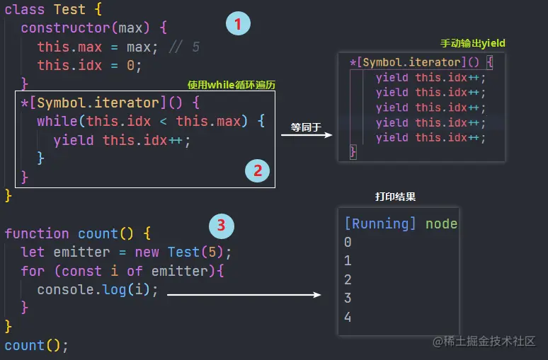 idx小于max,yield迭代传递idx++ - 创建一个基本函数,内部引用构造函数创建实例对象,传入的值表示