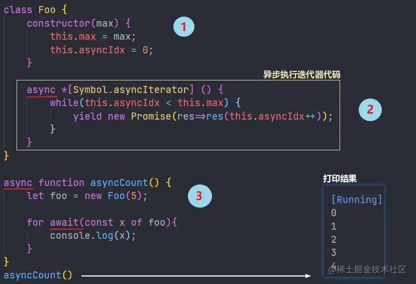 通过使用 async 关键字异步声明来定义一个基础的迭代器,再通过 async 和 await 搭配使用出 Promise 的异步行为;如下所示:
