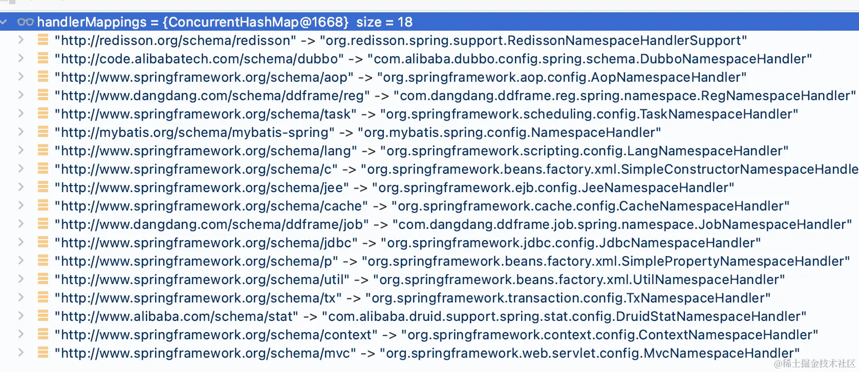 核心呢就是org.springframework.beans.factory.xml.DefaultNamespaceHandlerResolver#getHandlerMappings他会扫描类加载器下所有的META-INF/spring.handlers。但是有一点很坑,idea会自动触发toString方法,而toString方法会调用这个方法,很坑,没法调试。