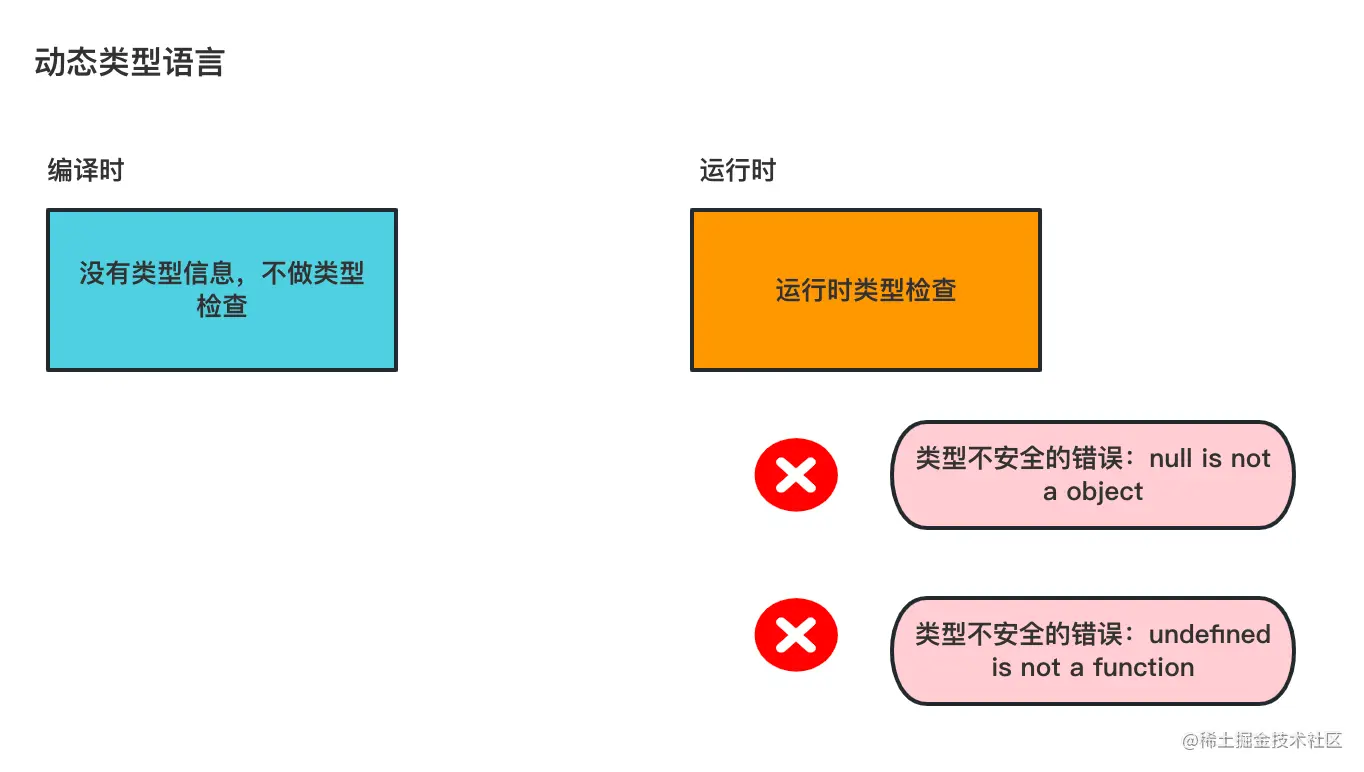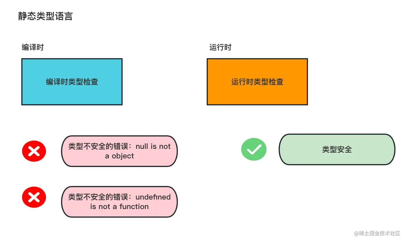 两种类型检查各有优缺点。动态类型检查 在源码中不保留类型信息,对某个变量赋什么值、做什么操作都是允许的,写代码很灵活。但这也埋下了类型不安全的隐患,比如对 string 做了乘除,对 Date 对象调用了 exec 方法,这些都是运行时才能检查出来的错误。