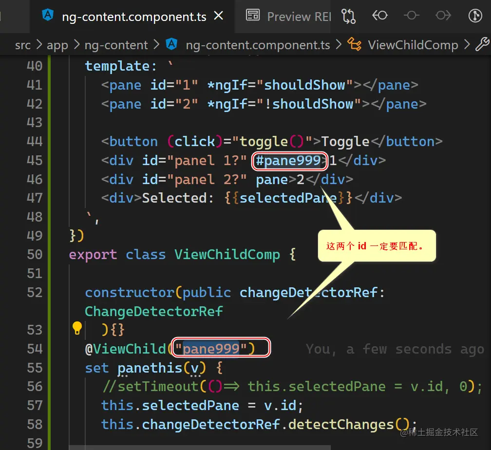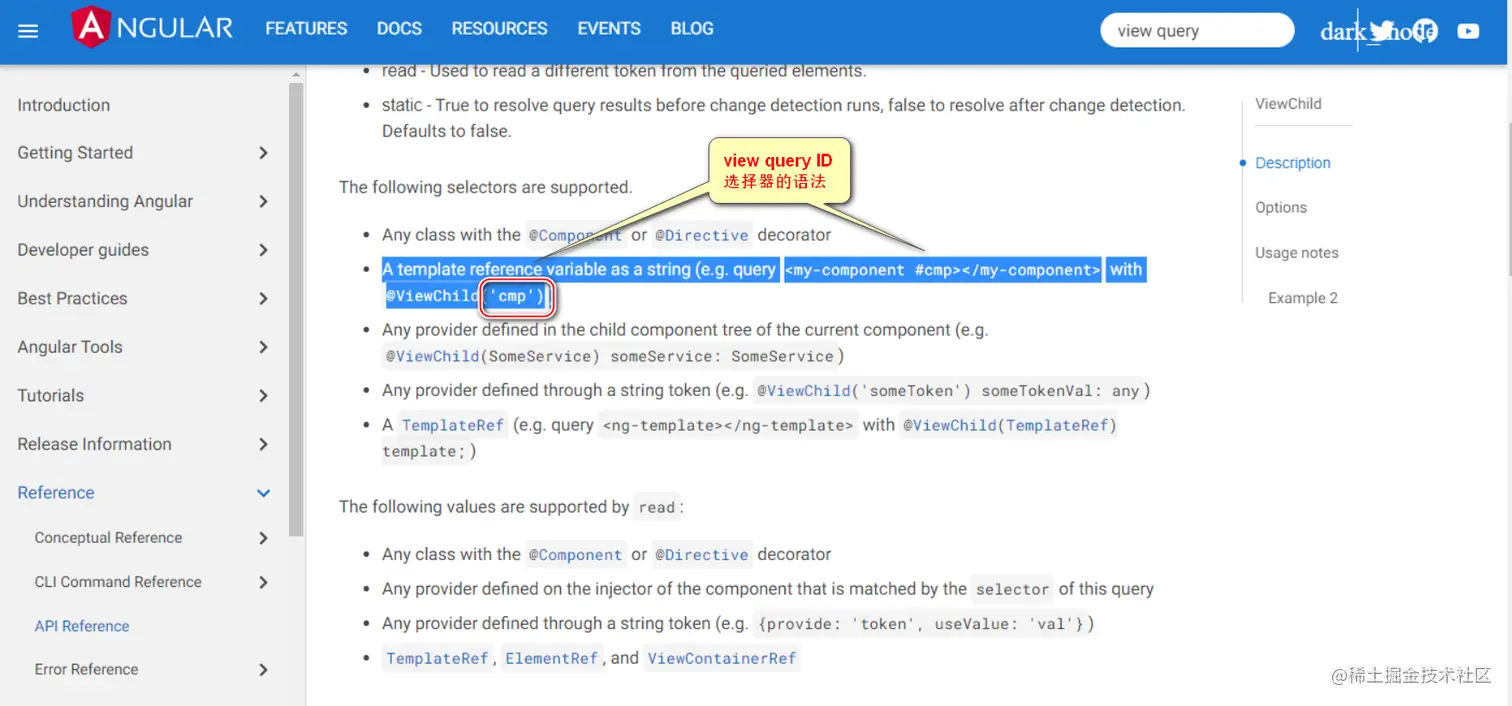 根据关键字 view query 查询 Angular 官网,发现在 view query 里使用 id 选择器的正确语法,并不是直接查询 HTML 元素的 id 属性,而是需要在 HTML 元素或者 ng-template 里使用符号 # 指定一个 id,然后将这个 id 传入 @ViewChild: