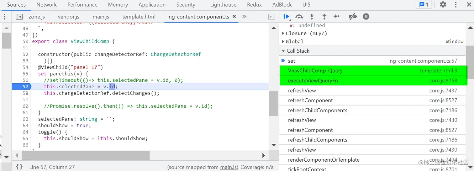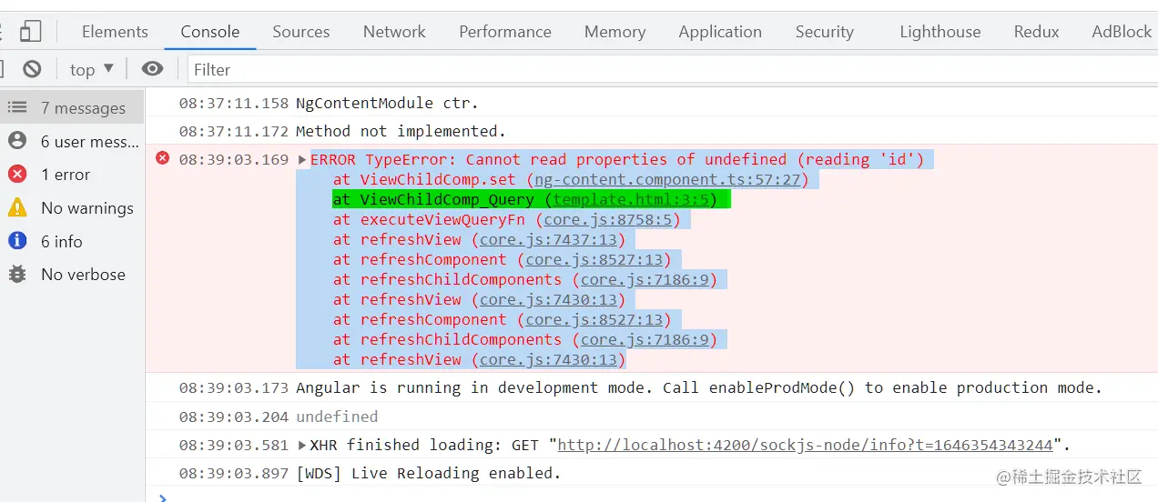 ERROR TypeError: Cannot read properties of undefined (reading 'id') at ViewChildComp.set (ng-content.component.ts:57:27) at ViewChildComp_Query (template.html:3:5) at executeViewQueryFn (core.js:8758:5) at refreshView (core.js:7437:13) at refreshComponent (core.js:8527:13) at refreshChildComponents (core.js:7186:9) at refreshView (core.js:7430:13) at refreshComponent (core.js:8527:13) at refreshChildComponents (core.js:7186:9) at refreshView (core.js:7430:13)