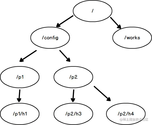 - 在图中,首先有一个由“/”分隔的znode。在根目录下,有两个逻辑命名空间 config 和 workers 。