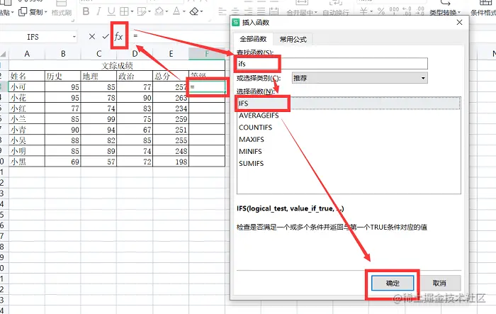 步骤一: 找到函数ifs,如图所示,在“插入函数”这个对话框内输入“ifs”,也可以一个一个去找,但是这样太浪费时间了,所以直接输入即可,最后点击“确定”,本文章用学生的成绩为例。