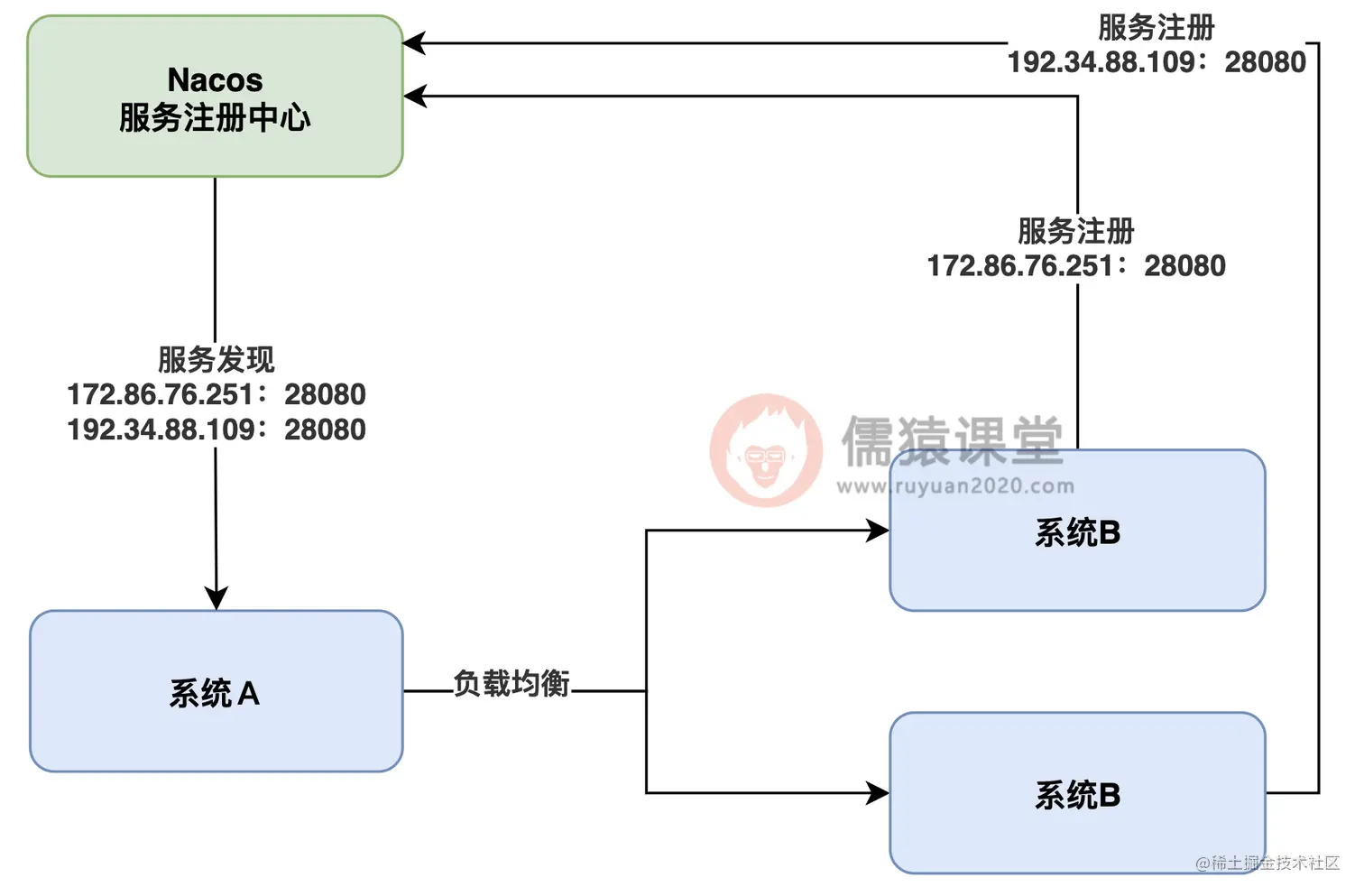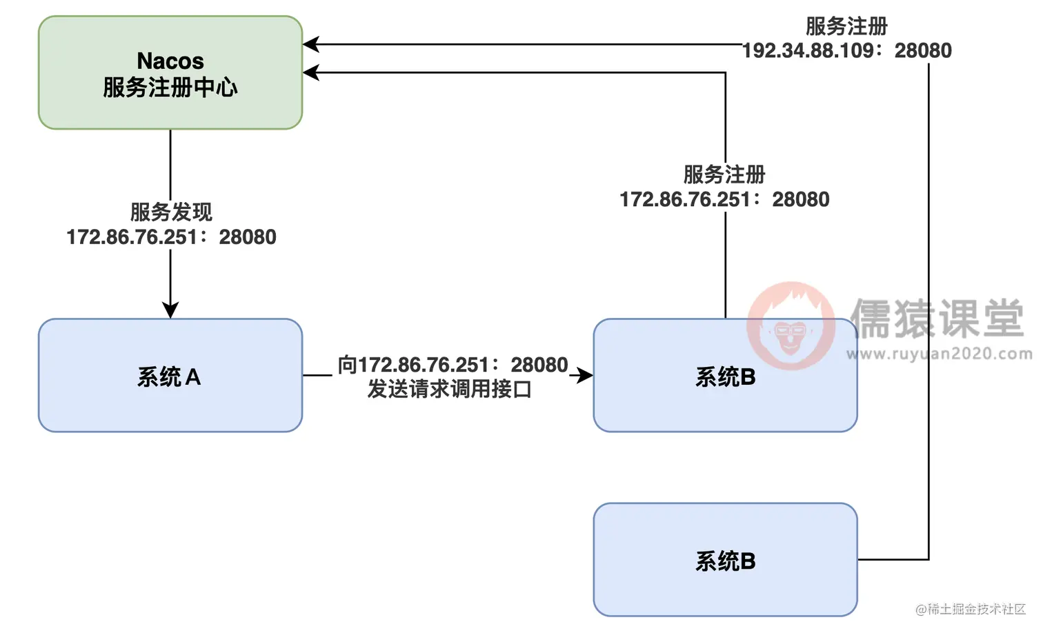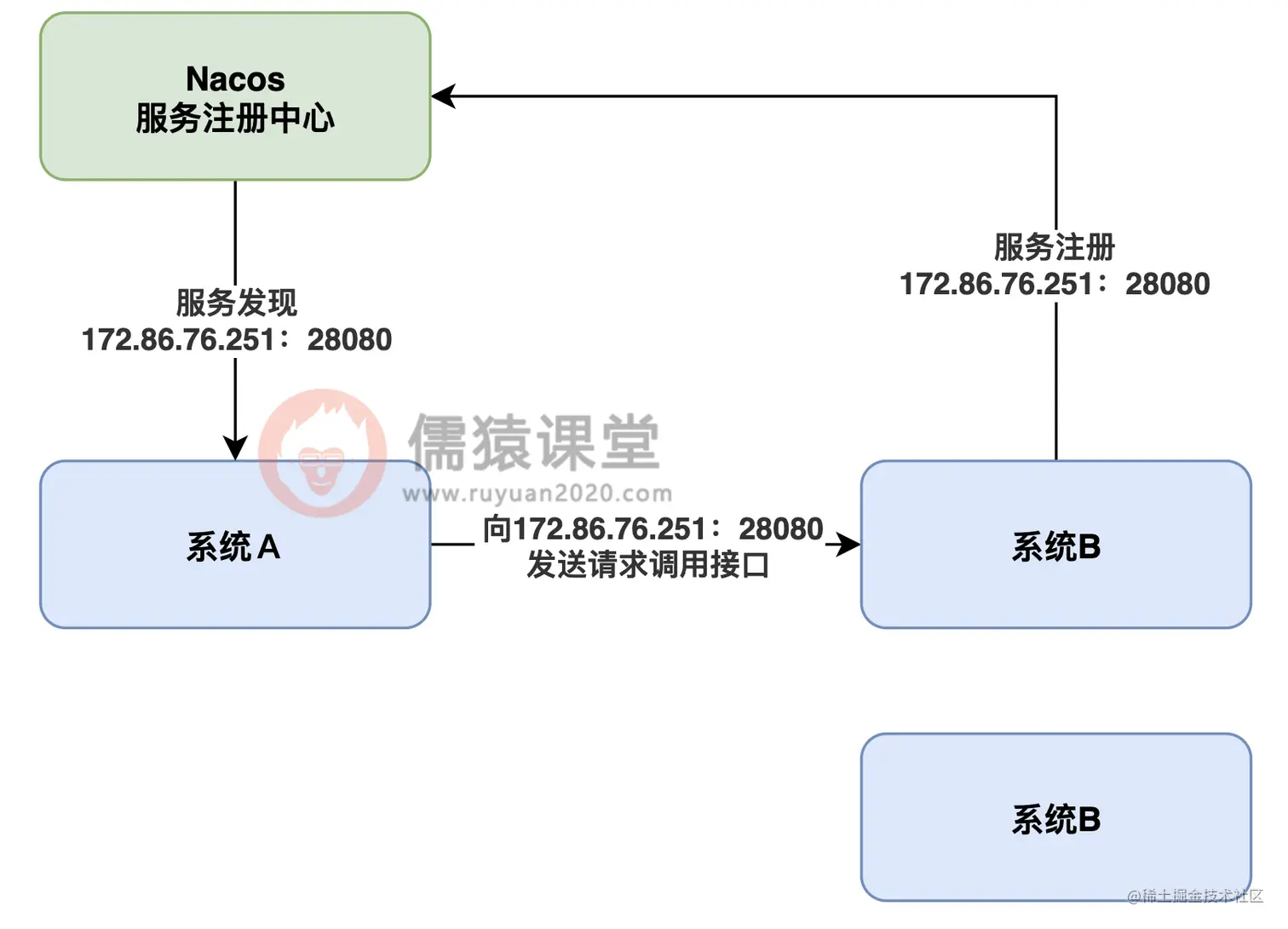 其实也很简单,系统B的每个服务实例部署了一台机器后,他们都得对Nacos服务注册中心发起服务注册的请求,所以Nacos是知道系统B部署的每台机器的ip地址和端口号的,看下图。