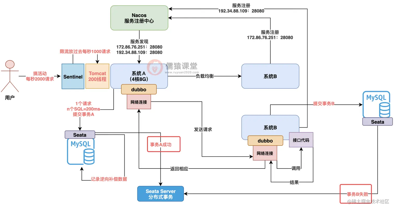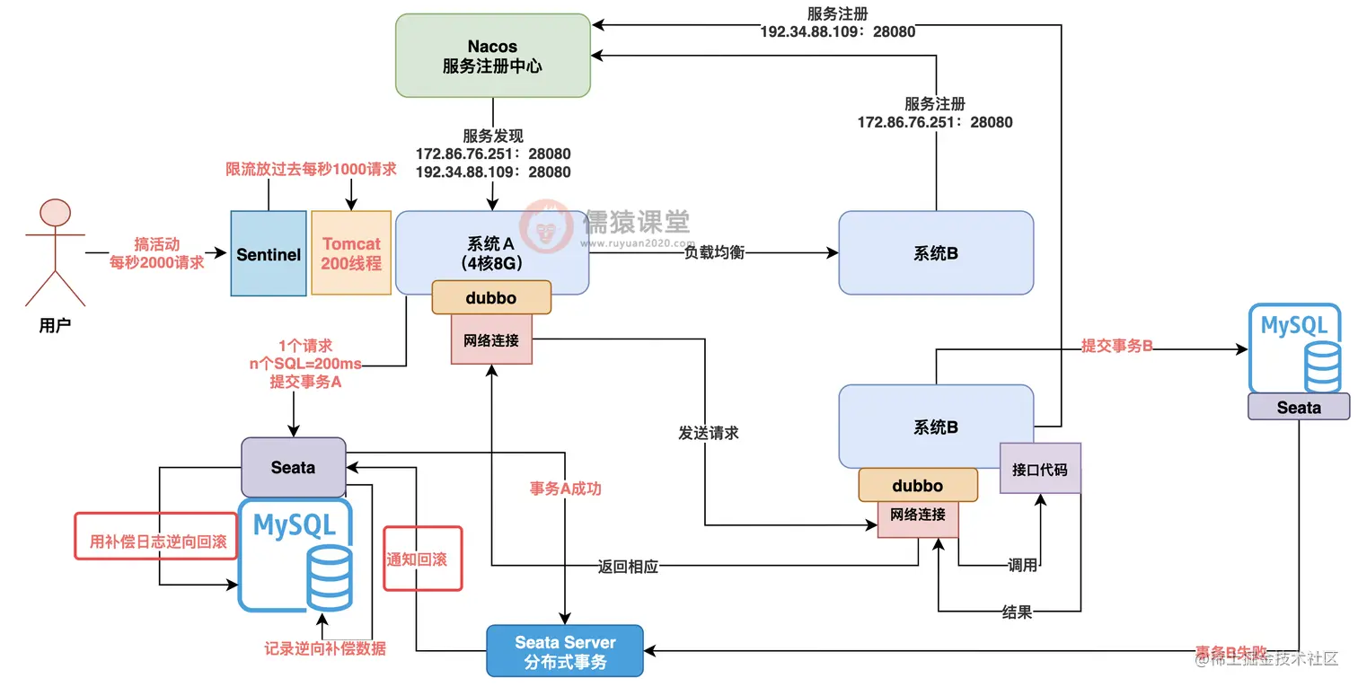 那现在我们已经搞明白SpringCloudAlibaba里的三个组件的运行原理和使用场景了,Nacos是服务注册中心,Dubbo是RPC调用框架,Sentinel是流量防护组件,接着来看最后一个组件,那就是Seata,分布式事务组件。