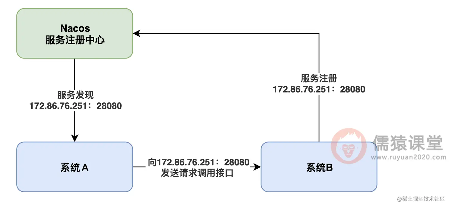 然后呢,Nacos服务注册中心绝对会很大方的把系统B的微信号,奥不对,是系统B的机器ip和端口号都告诉你的。这时系统A知道了系统B的ip地址和端口号,就可以发送请求过去调用系统B的接口了,大家请看下图。
