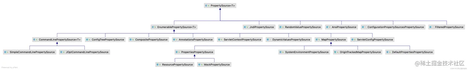 右半部分说完,我们来看左半部分,左边都是PropertySource的子类EnumerablePropertySource类的派生类,如下: