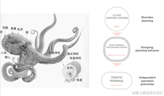 章⻥的主脑是神经中枢(集中了总神经元的40%,),⼋个腕⾜脑(分布60%的神经元),形成独⽴的神经索。章⻥的⼋个腕⾜可以在主脑不参与的情况下,单独完成很多复杂的任务。\