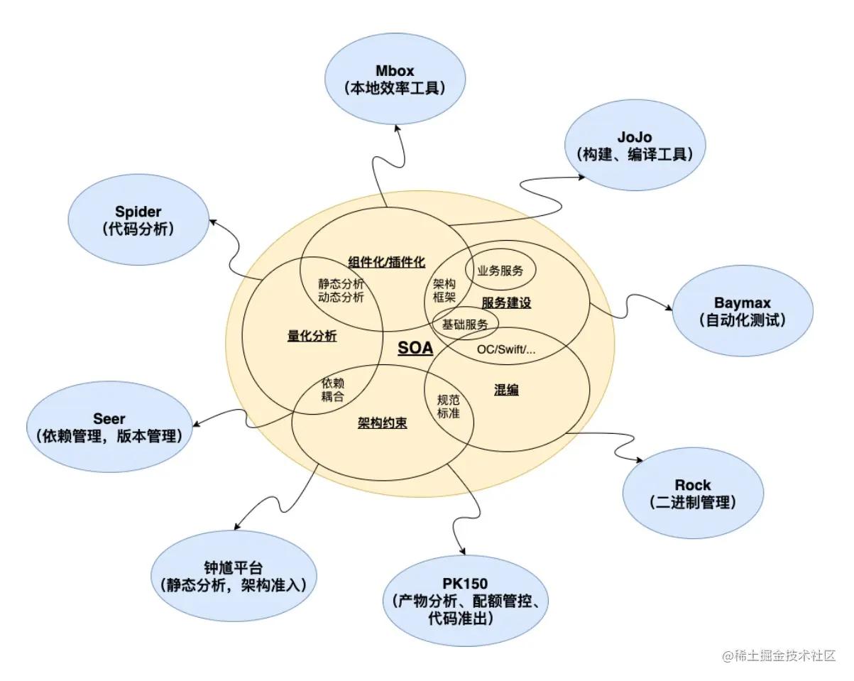在年前我们团队做了一次对外的技术分享:超全回顾 | 5位抖音工程师揭秘抖音iOS基础技术(附PPT和回放视频)。有兴趣的话可以通过这次分享视频了解我们在做的事情和当下的技术储备。下面这张图代表着当下 iOS 基础技术团队的建设成果及业务范围: