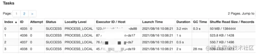 数据倾斜分为map倾斜和reduce倾斜两种情况。本文着重介绍reduce 倾斜,如SQL 中常见的group by、join 等都可能是其重灾区。数据倾斜发生时,一般表现为:部分task 显著慢于同批task,task 数据量显著大于其他task,部分taskOOM、spark shuffle 文件丢失等。如下图示例,在duration 列和shuffleReadSize/Records列,我们能明显发现部分task 处理数据量显著升高,耗时变长,造成了数据倾斜: