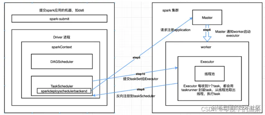 TaskScheduler 有sparkdeployschedulebackend 进程,去和Master通信,请求注册Application;