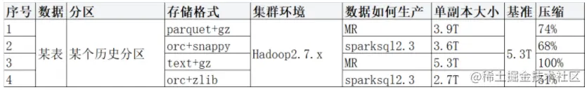 同时,我们也对parquet+gz、orc+zlib的内存消耗进行了测试。以某表的单个历史分区数据为例,parquet+gz、orc+zlib比txt+gz 分别节省26%和49%的存储空间。