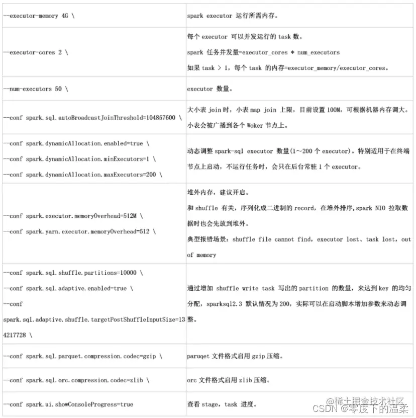 针对无数据倾斜的情况,我们梳理总结了参数配置参照表帮助大家进行Spark性能调优,这些参数的设置适用于2T左右数据的洞察与应用,基本满足大多数场景下的调优需求。