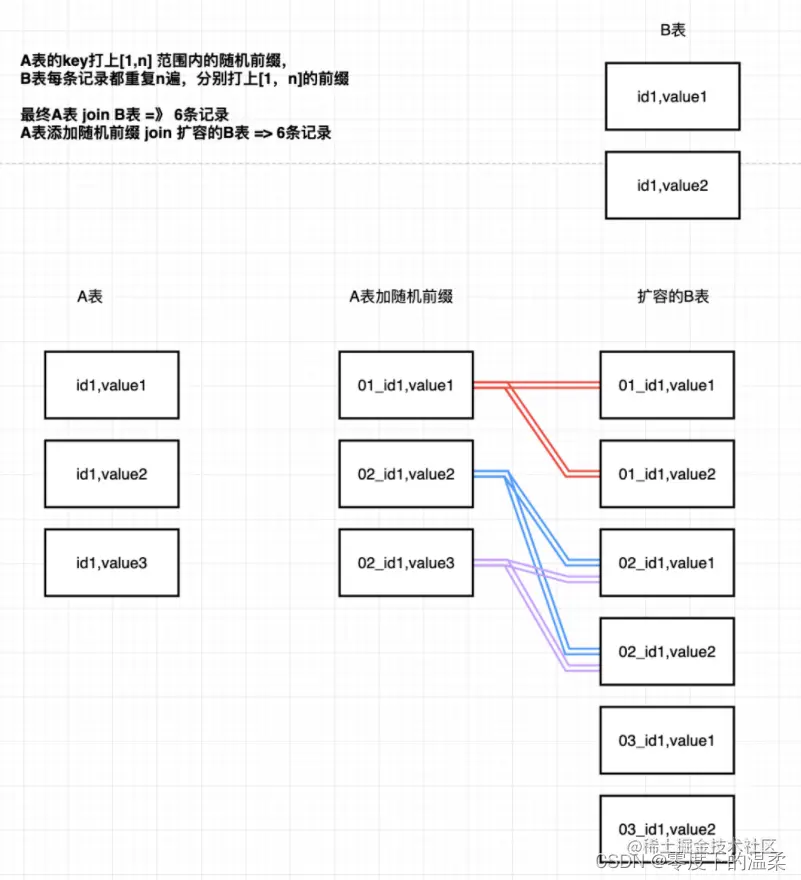 - 对A表每条记录打上[1,n] 的随机前缀,B表扩容N倍,join。