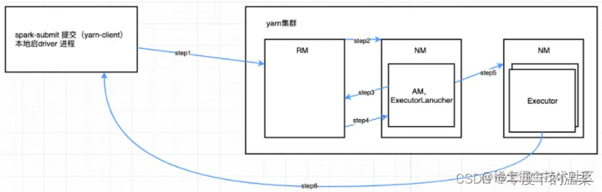 RM 分配container 在某个NodeManager(NM)上,启动AM,实际是个ExecutorLauncher;