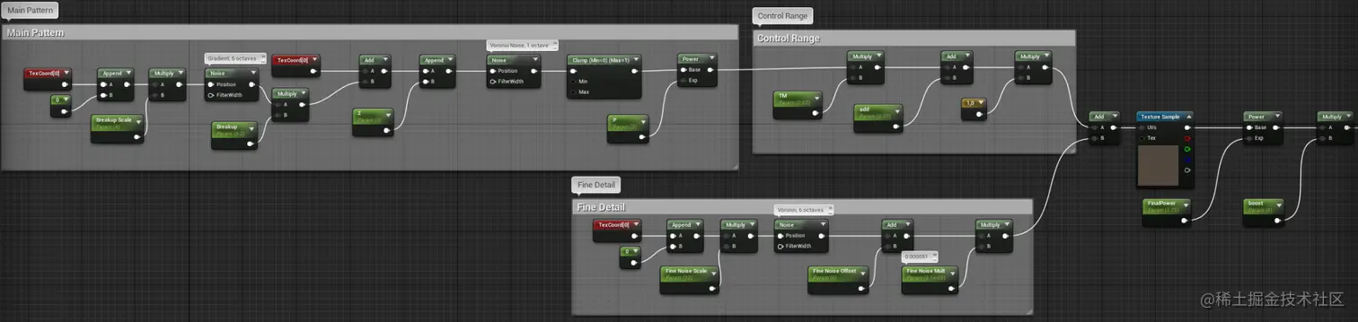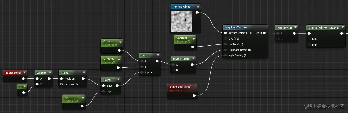 “高通滤波” 是使用新的材质功能 “高通滤波纹理(High Pass Texture)” 执行的。边缘变化是通过添加另一个 梯度噪声 来实现的,该噪声的作用是使偏移宽度变化。此版本的高通滤波功能需要一个纹理,所以在此时保存了该纹理以便使用: