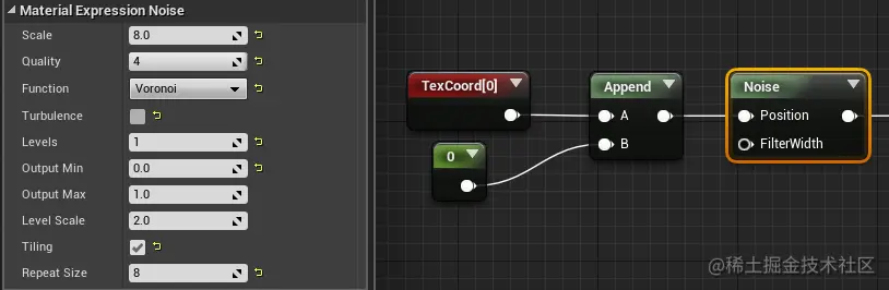 在 4.13 中,如果把一个 “噪声(Noise)” 节点放进材质中,您将会注意到底部有两个新的选项,名为 平铺(Tiling) 和 重复大小(Repeat Size):