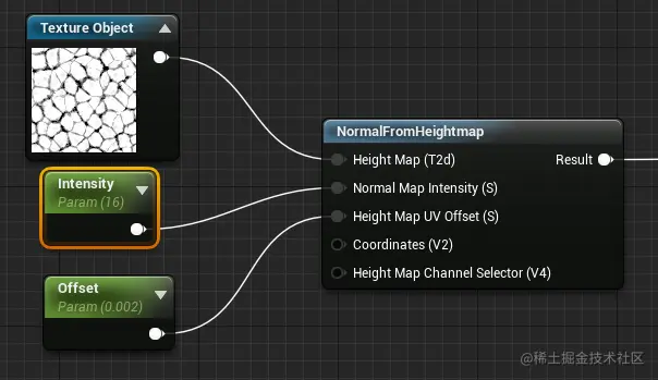 要烘焙法线,只需要将上面第 3 步的结果烘焙到 渲染目标,然后使用 “根据高度贴图建立法线贴图” 功能,再将此材质渲染到 渲染目标: