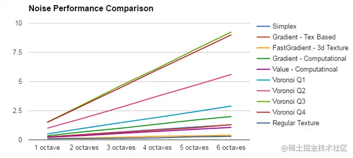 为了演示使用噪声节点的真实成本,我使用一个全屏幕四边形,测量了每种功能使用 1-6 个倍频程的性能成本。我还增加了与矩形纹理取样的比较。对于矩形纹理取样,倍频程只是相加在一起的附加取样。
