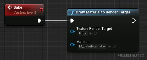 现在打开新添加的蓝图,导航至 “事件图(Event Graph)” 。添加一个 定制事件,将它命名为 “Bake” 。指定要烘焙的材质和您创建的渲染目标。