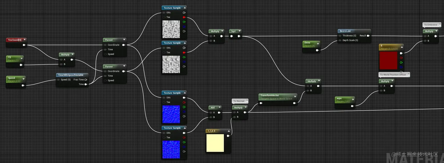 这效果是通过对两个作为 平移纹理 的简单沃罗诺伊纹理进行取样得到的。系统将两个纹理 相乘 ,然后 取平方根 ,以保持翻腾形状的完整性。然后将它应用到 铺嵌 的圆柱体网格上。请注意,要先将 最终高度 乘以 全局空间法线 ,然后才能连接到 全局位置偏移 。