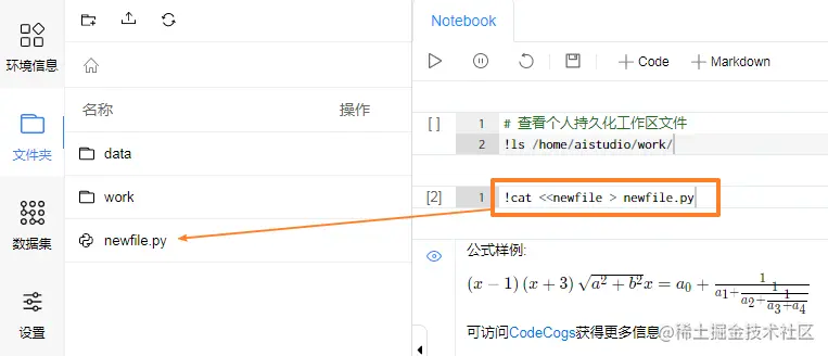 用户也可以使用命令, !cat <<newfile > newfile.py 在项目空间内直接创建文件, 之后双击进行编辑. 如下图所示: