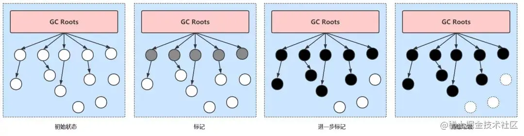 白色:该对象没有被标记过。(对象垃圾)