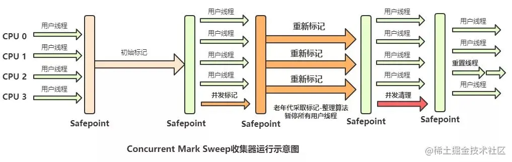其中初始标记、重新标记这两个步骤仍然需要“Stop The World”。初始标记仅仅只是标记一下GCRoots能直接关联到的对象,速度很快;