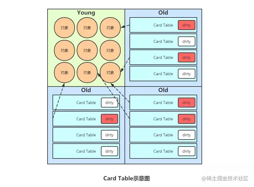 YoungGC时,我们在进行对一个对象是否被引用的过程,需要扫描整个Old区,所以JVM设计了CardTable,将Old区分为一个一个Card,一个Card有多个对象;如果一个Card中的对象有引用指向Young区,则将其标记为Dirty Card,下次需要进行YoungGC时,只需要去扫描Dirty Card即可。 -