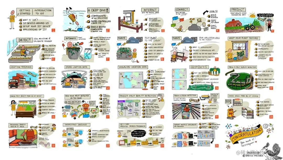 物联网基础课程共 24 节课程,除了讲解 IoT 相关的内容,还包含一些项目和案例。