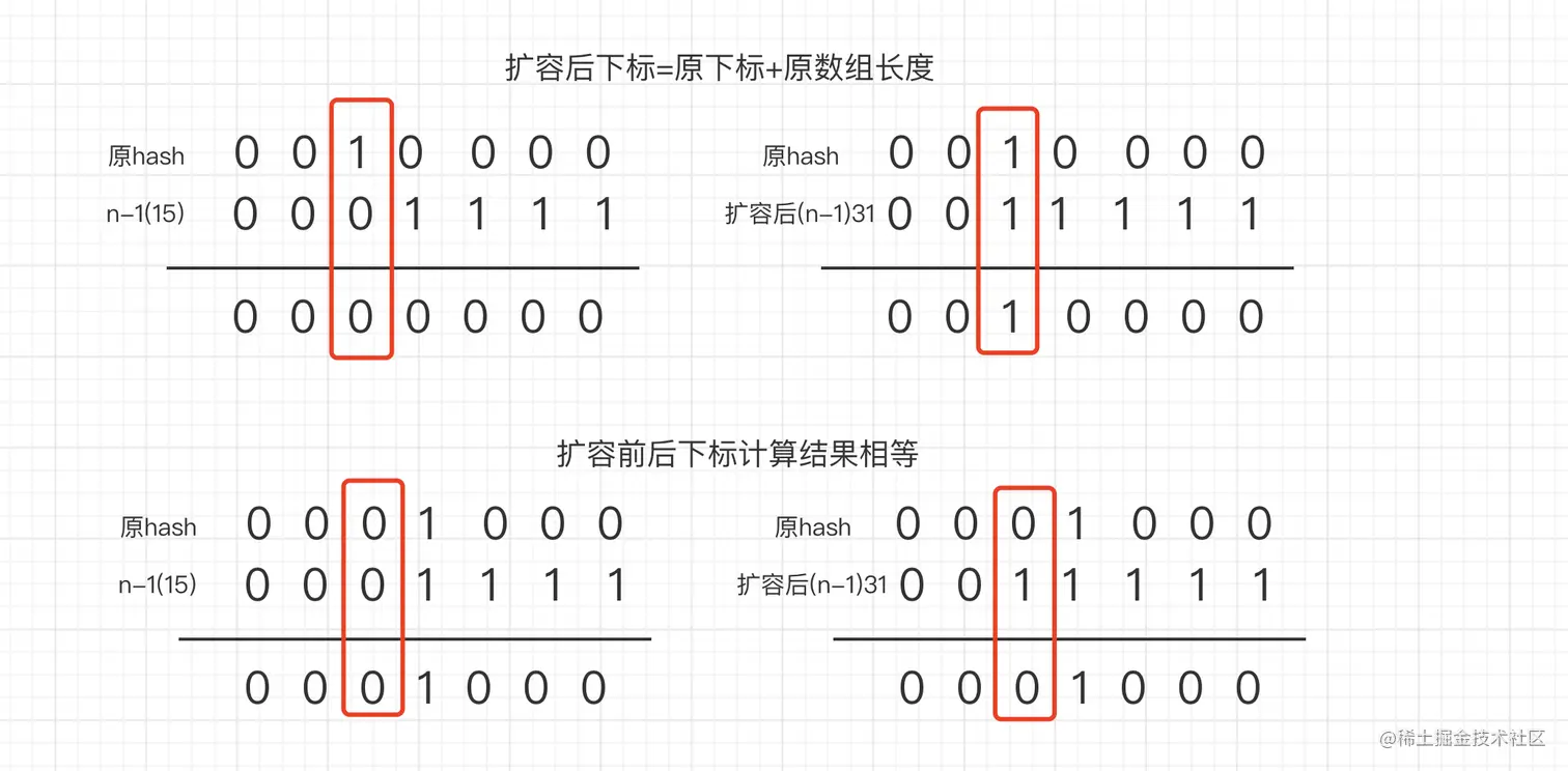 在计算下标时,用hash&(n-1),保留的是hash的低位值。16-1 = 10000 -1 = 01111,与运算就是保留了低4位,当从长度16扩容到32时,拿hash再与n-1做与运算,其实就是看这低位第5位是0还是1,如果是0,则是在原位置,如果是1,则是在新位置,而新位置就是最高位1+原hash的低4位,所以就是原hash的低4位+10000,也就等同于原下标位+原数组长度。举个例子如图。