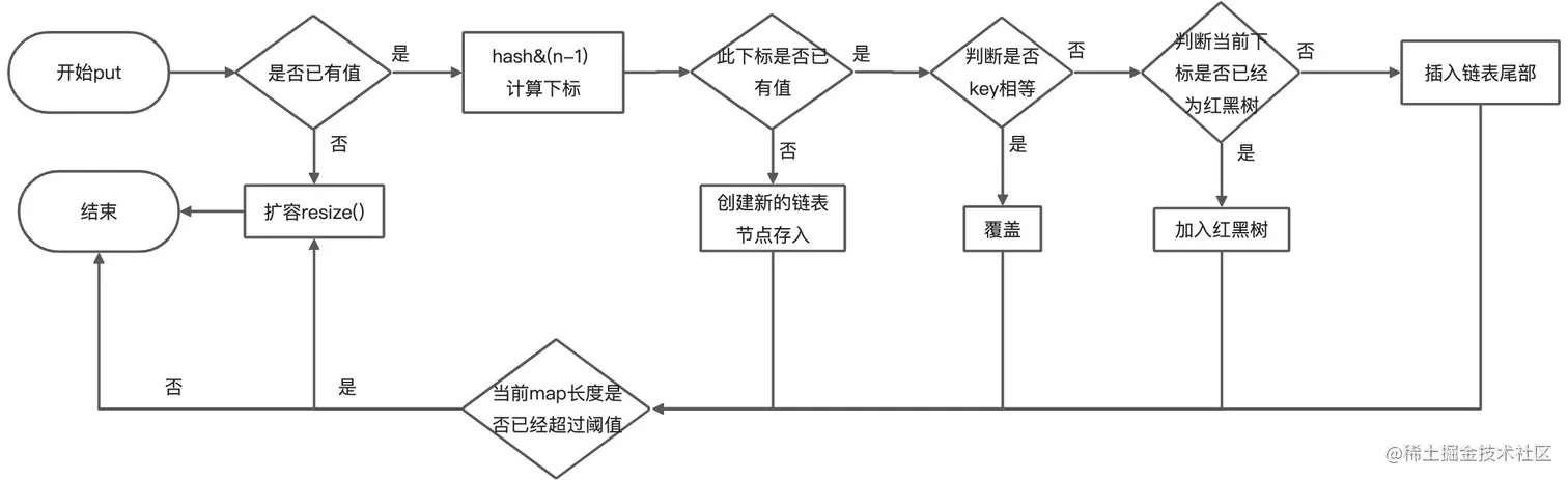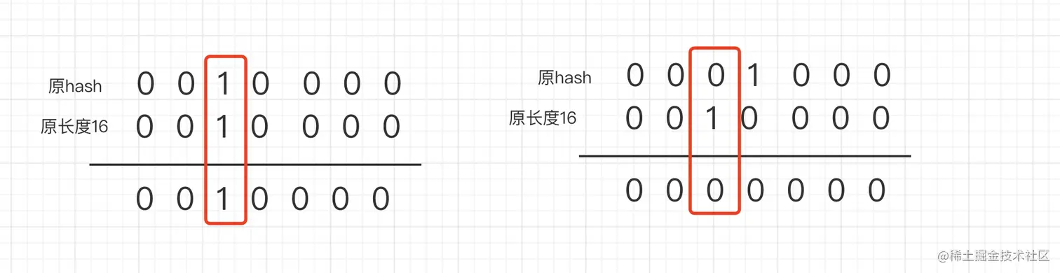 在扩容遇到红黑树或者链表需要计算新下标时,也只有两种情况,所以是拿if ((e.hash & 原数组长度) == 0) 的判断,来区分新下标是保持原位,还是+原数组长度。也是得益于“数组长度一定是2次幂”这一规定,所以也是只需要看低位第n位是0还是1,就能判断。