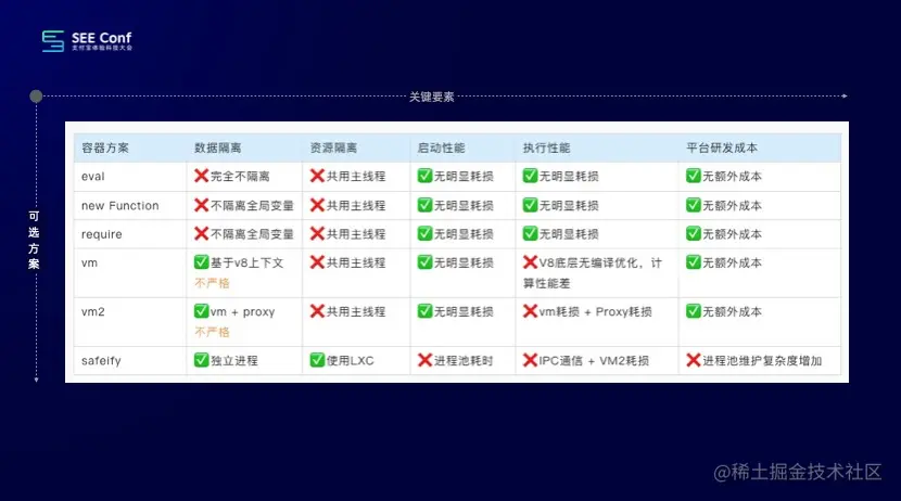 数据隔离上,vm 是 node 原生支持的稳定特性,底层是用了 v8 引擎的 ScriptCompiler::CompileUnboundScript 来编译,上下文层面实现了隔离,但在语言的对象引用链上还是难免会有遗漏,可以满足正常业务隔离,无法解决恶意的攻击行为。