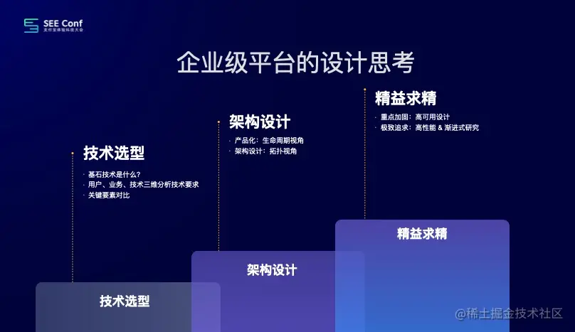 首先肯定是技术选型,技术里没有银弹,选择最合理的技术方案是关键。先回答基石技术(决定性技术)是什么?然后作为技术**“产品”**,要理清用户、业务、技术三者的诉求、权重,作为后续的选型标准和架构原则。最后就是对关键技术要素进行客观的对比分析,得到理性结果,而不是笼统的拍个脑袋,或是吵得面红耳赤。