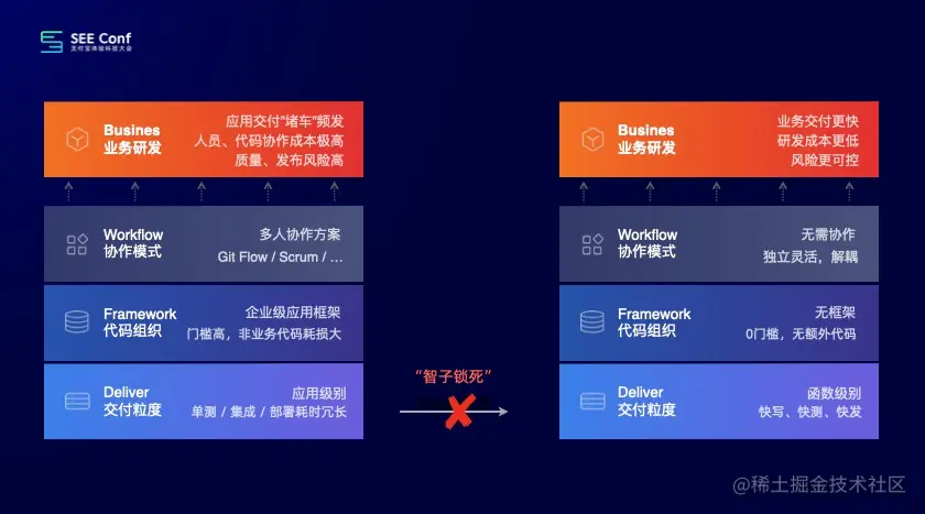 BFF 一般都是业务粘合接口,接口在代码形态上天然就是函数,如果我们能迁移到函数级别的交付平台上,那在交付上就可以做到快写、快测、快发,代码组织也无需框架极大降低门槛,大部分协作问题也自然消失了。