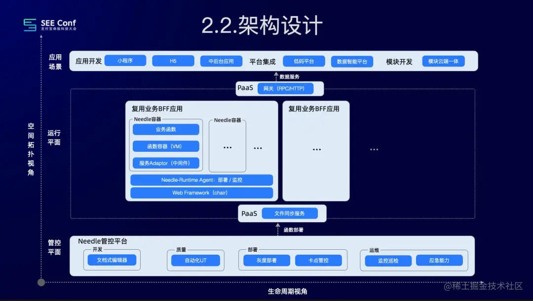 大型系统的架构设计,我们通常需要从多个维度考虑架构的构成、组织关系。Needle 作为一个偏服务端的技术产品,可以参考 PaaS 类技术平台的架构设计思路,从拓扑结构和生命周期两个角度组织关键能力。