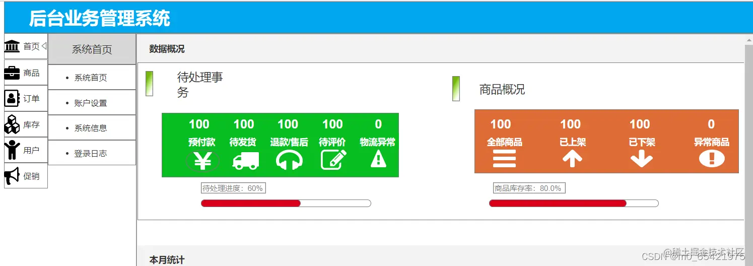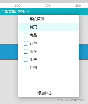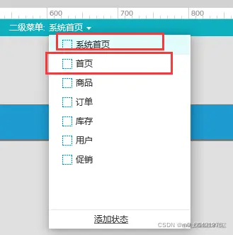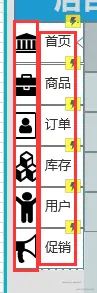 10.给二级菜单添加新的状态,依次分别为:首页、商品、订单、库存、用户、促销,每个状态所对应的左侧一级菜单的矩形框内容。