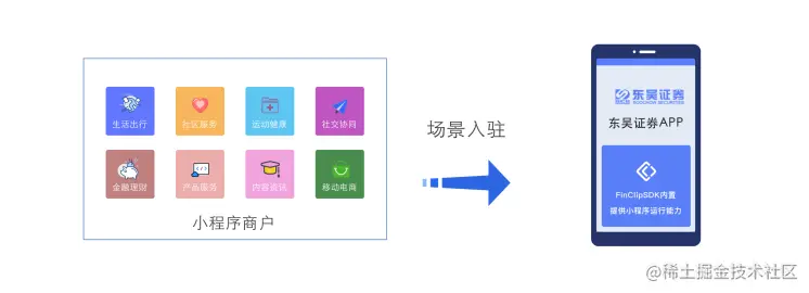 - 以移动领域为新战场:东吴证券 App 通过接入 FinClip 小程序运行时 SDK,从而使得 App 获得小程序运行能力。同时,FinClip高度兼容微信小程序的能力,让应用一端开发,多端上架成为可能。通过技术手段打通公(社交平台)- 私域(APP)流量,将业务应用最大化的传播并让客户感知;