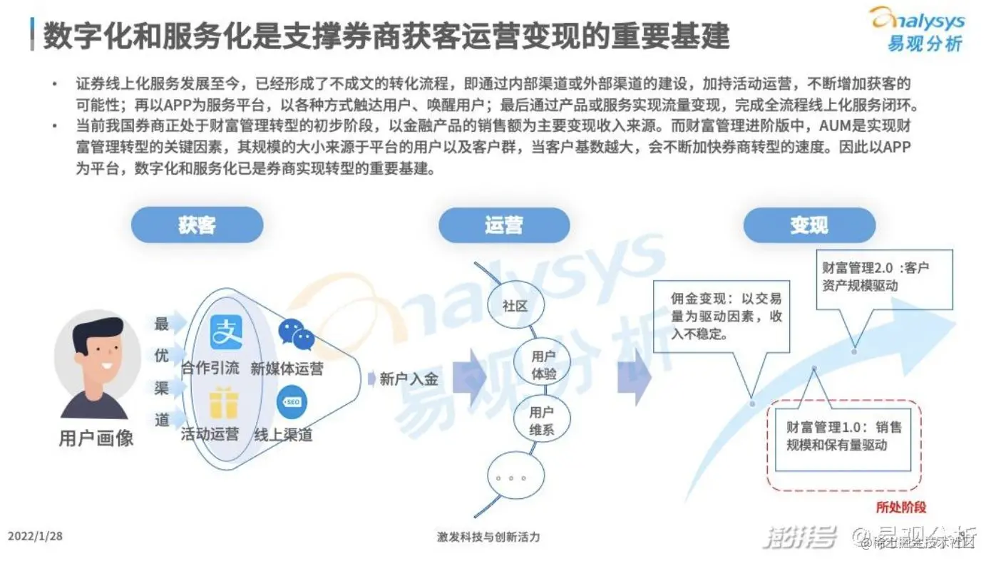 易观分析在其《2022年中国证券类APP创新专题分析》报告中指出:数字化和服务化是支撑券商获客-运营-变现的重要基建。